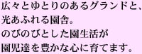![]() 本園は名東区と天白区の境、県営高針住宅西南の、交通便利な好立地に昭和55年に開園しました。近年、人口の増加に伴い、周辺環境もいっそう充実してきました。園内では、毎日たくさんの元気で明るい声が響きわたり、広々としたグランドと光あふれる園舎では、先進の教育と指導によって質の高い人間形成を行うと同時に、のびのびとした園生活によって明るく豊かな心を育んでいきます。 |