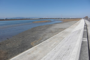 河川工事に於いては東日本大震災以降問題になっている河川堤防の液状化対策工事及び河川改修工事等を行っています。